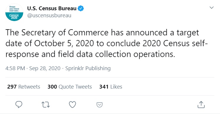 On Sept. 24th the U.S. District Court of the Northern District of California issued a preliminary injunction that enjoins the U.S. Census Bureau from ending its counting operations on September 30, extending the time to Oct 31. On the afternoon of Sept. 28th, despite that court order, the Census Bureau tweeted (see below) that it would be ending field operations on Oct. 5th. Chaos ensued.