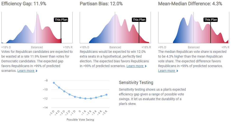The analysis gives plan-wide scores for several statistical measures that have been used in major redistricting litigation like the efficiency gap, partisan bias, and the mean-median difference. According to Nicholas Stephanopoulos, a Harvard Law professor and member of the project, analyses are based on a “model incorporating election results for all congressional delegations and state legislatures from 2012 to 2018”.