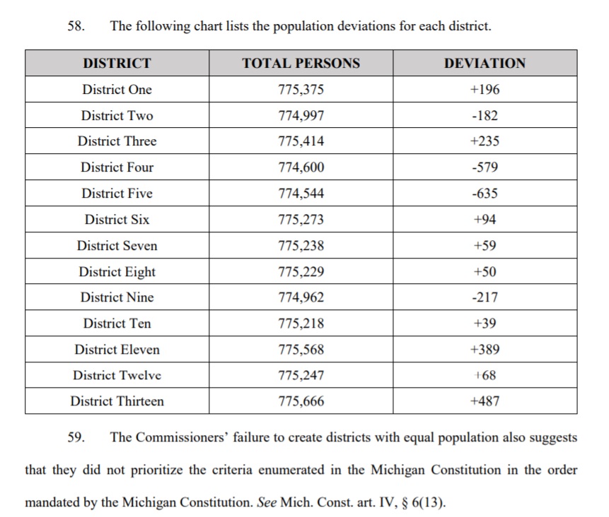 The congressional map is also being challenged in state court, see Detroit Caucus v. Independent Citizens Redistricting Commission. The federal lawsuit also alleged several other failings of the commission’s map including failure to follow the required state legal criteria regarding honoring communities of interest, consideration of county, city, and township boundaries and compactness. Below is a screenshot of the congressional district deviations listed in the complaint.