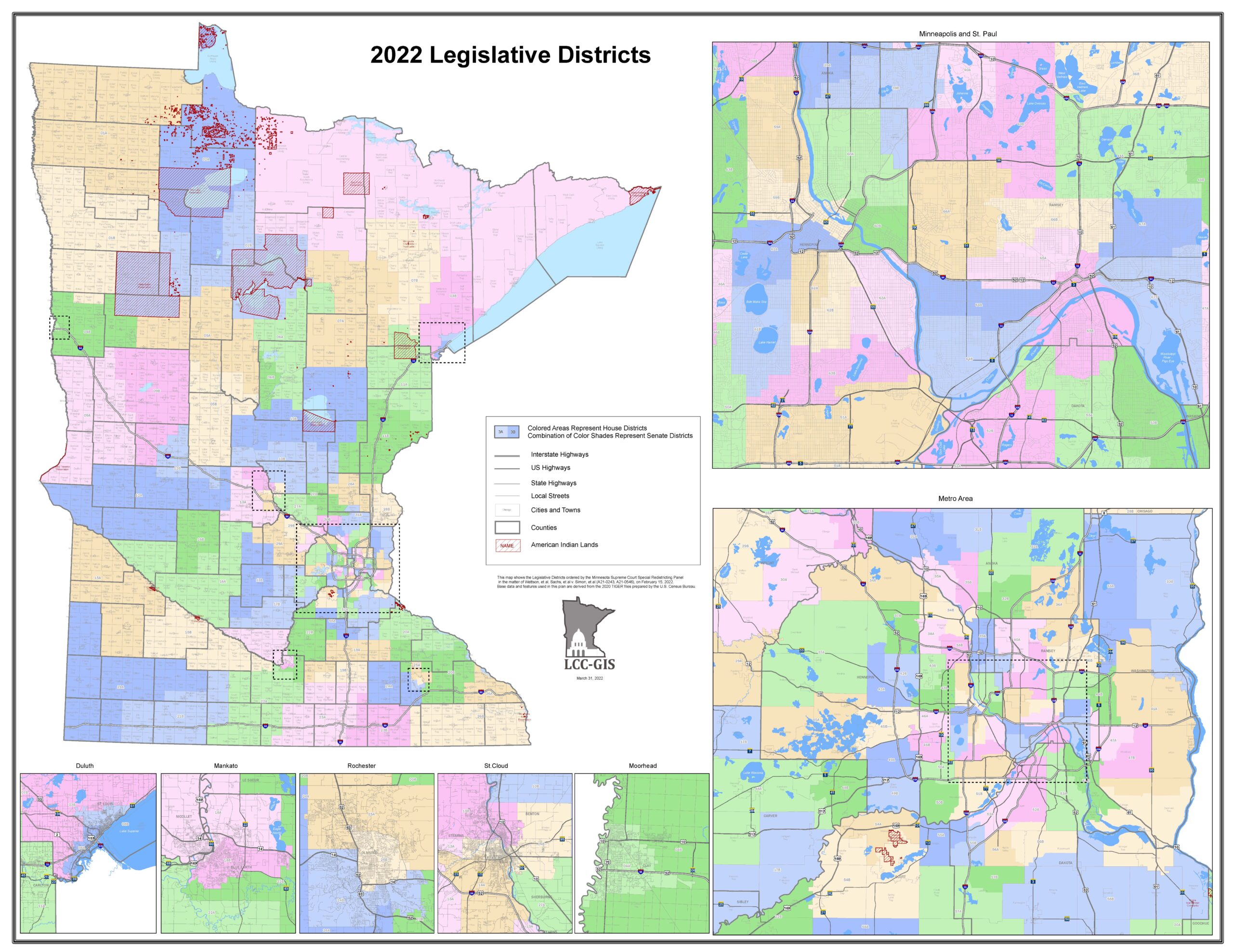 State legislative districts followed the same court-supervised path. In Wattson v. Simon, the Special Redistricting Panel also adopted new Minnesota House and Senate maps on February 15, 2022, replacing the prior decade’s districts for use beginning in 2022. Between May 2022 and May 2023, several technical and proposed boundary changes have been adopted. The can be found on the Legislative Coordinating Commission's website.